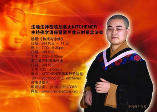 2006年8月10~12日法隆法师应邀至加拿大安省KITCHENER市般若讲堂做《持戒与念佛》的讲座与主持三时系念法会,少长咸集,群贤毕至,法喜充满,盛况空前。